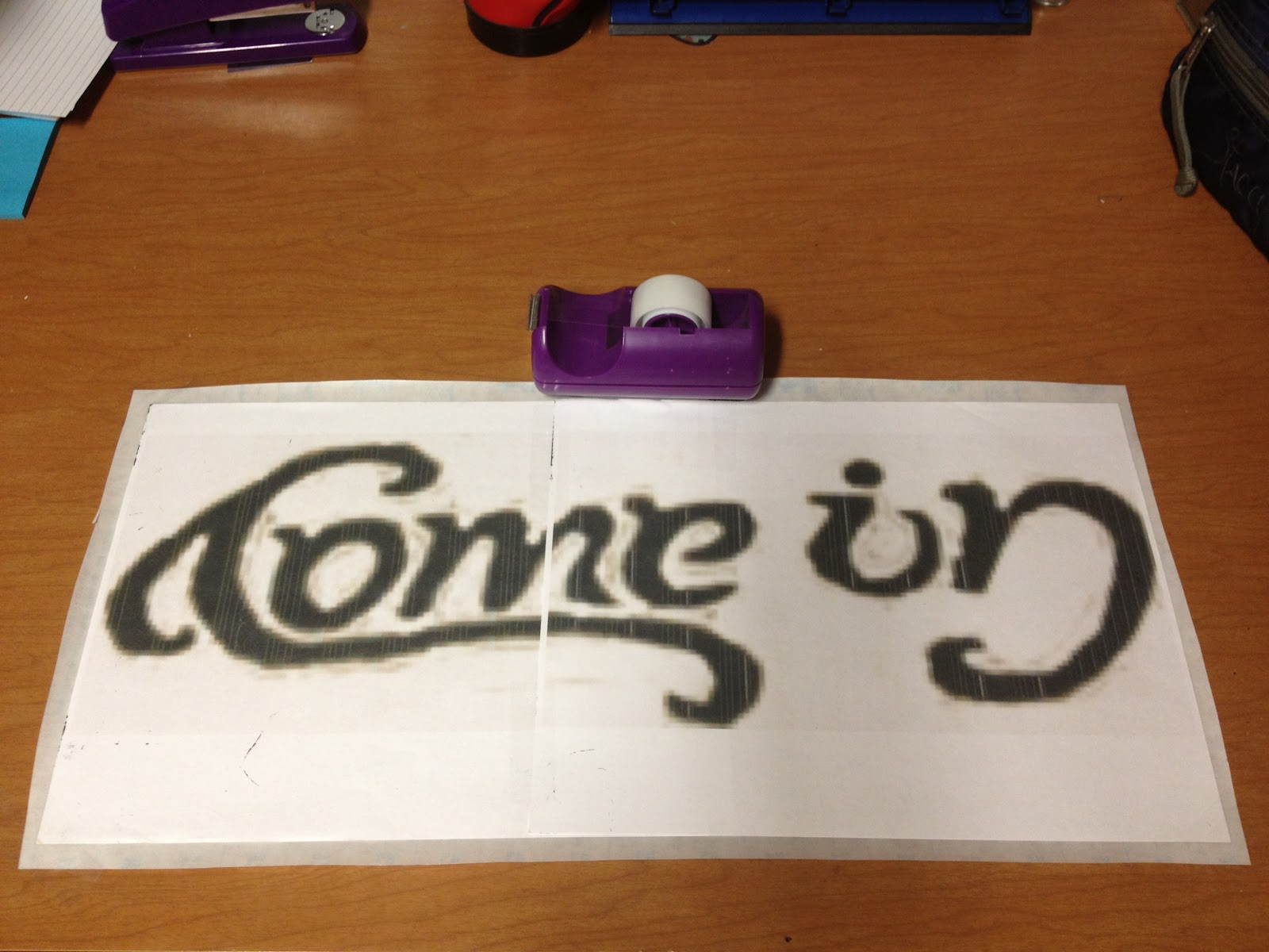 It doesn't have to be perfect, you can always fix it with the paint! Next, still making the stencil, I put this edited picture onto a blank PowerPoint (I do everything in PowerPoint) and, keeping the proportions the same, played with the size of my words. Once I decided on the size, I printed off the slides, making sure that my text took up as much of the page as possible. I then overlapped the two pages, making one cohesive ambigram on one large sheet of paper.